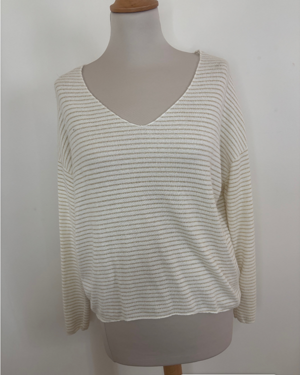 Apportez une touche raffinée à vos tenues avec ce pull col V orné de fines rayures dorées. Léger et élégant, il combine confort et style pour un look chic au quotidien.