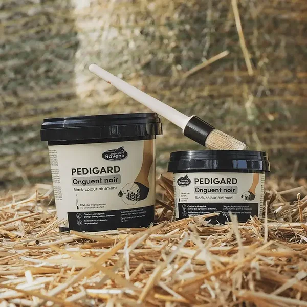 PEDIGARD Onguent Noir contribue à fortifier la corne tout en préservant son élasticité. L’huile de baie de laurier, riche en acide laurique assouplit la corne en profondeur. La cire d’abeille, nourrisante car riche en vitamine A, apporte également une action imperméabilisante : elle retient l’eau dans le pied, permettant de lutter contre le dessèchement et joue le rôle de barrière contre les agressions extérieures. Cette barrière est renforcée par le charbon végétal dont la porosité lui confère une capacité d’adsorption des agents extérieurs. Souple et protégé, le pied retrouve toutes ses propriétés biomécaniques.